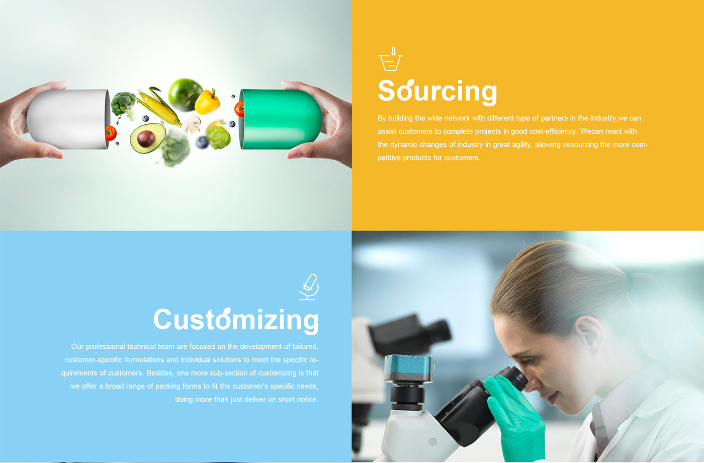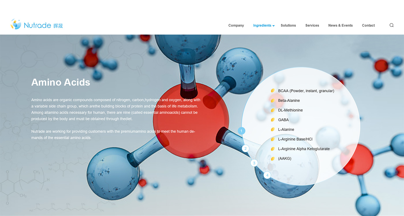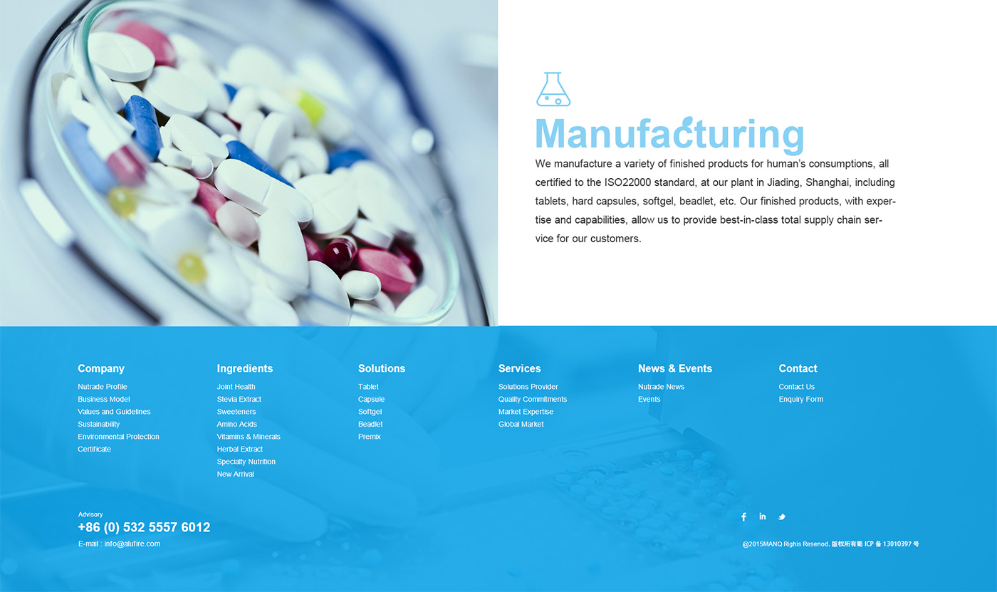 外貿網站設計與開發,暉昇面對海外要企業,網站首頁廣告圖以貫穿暉昇制藥從原料到成品的過程,網站體現暉昇制藥從原料的選材和成份的提煉到成型和包裝。