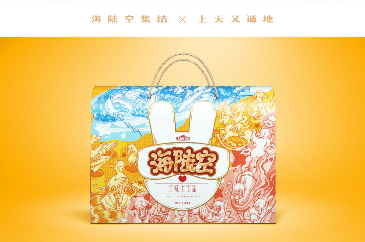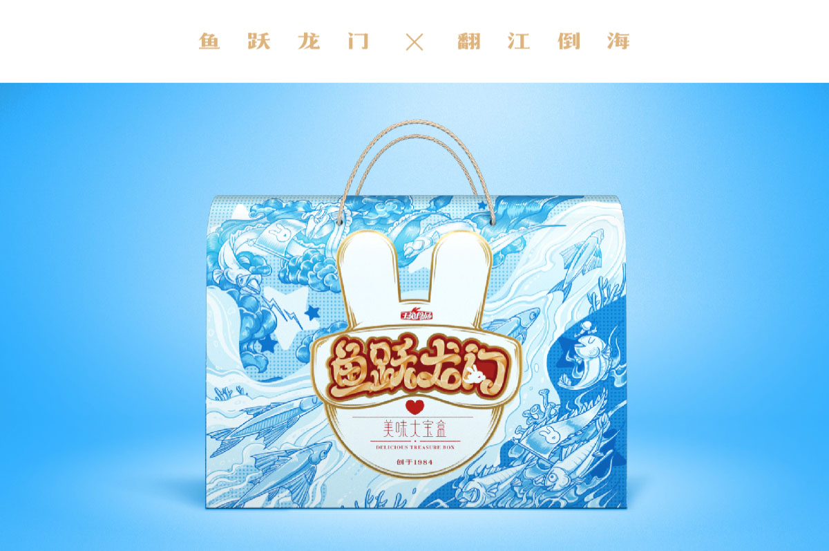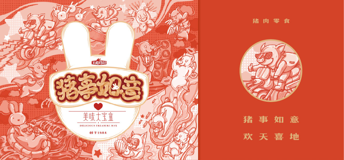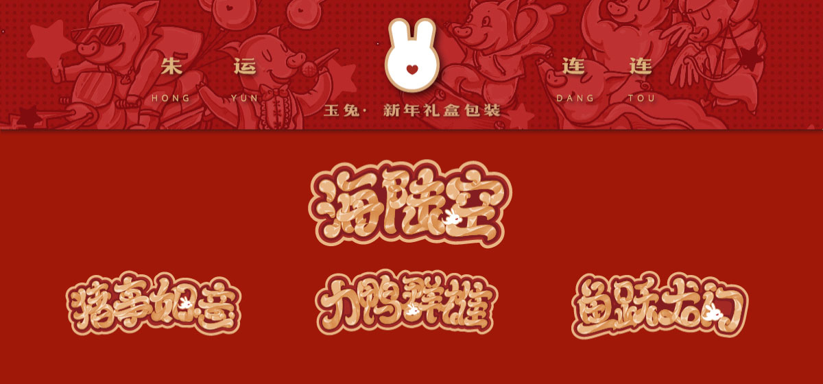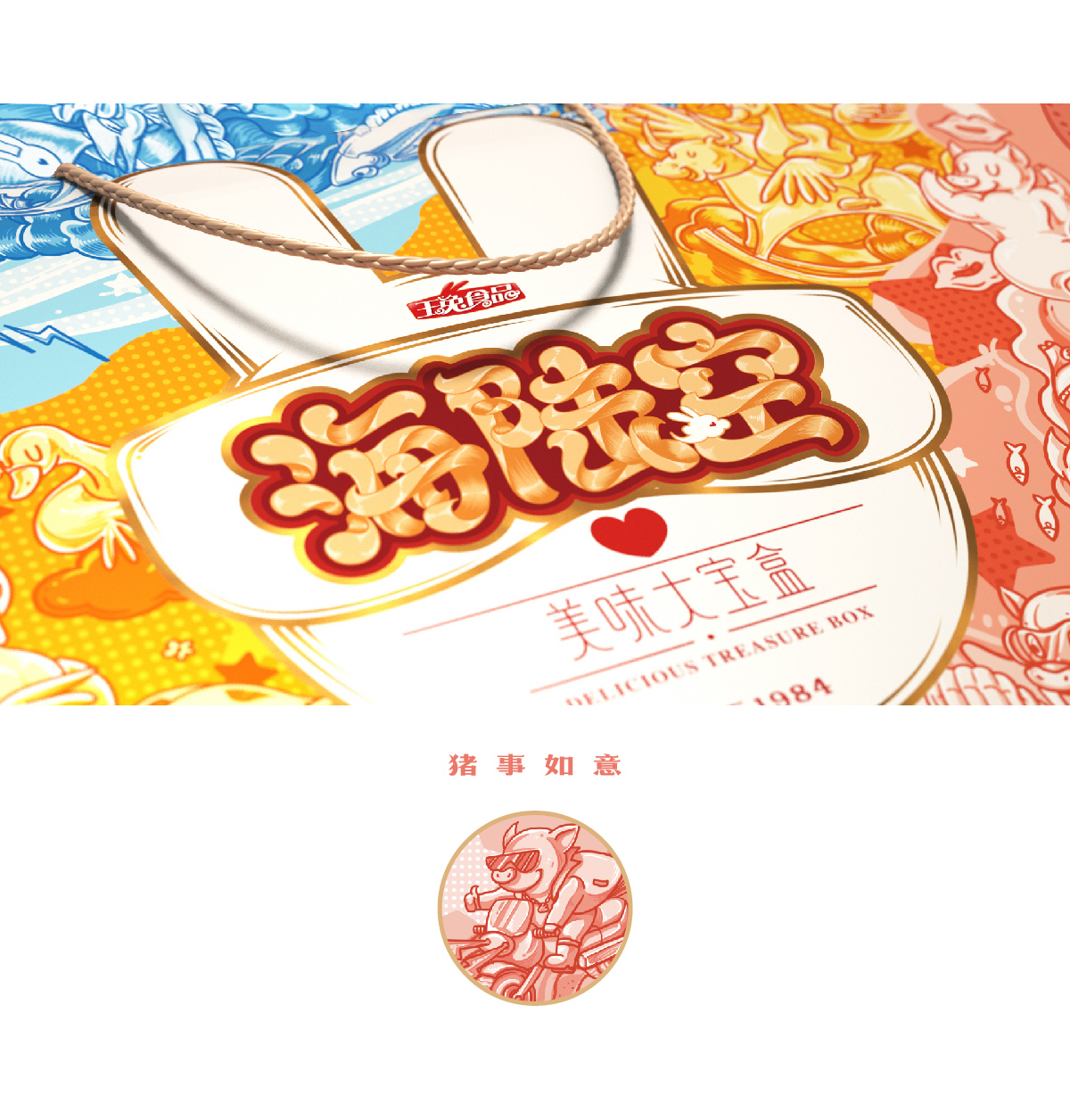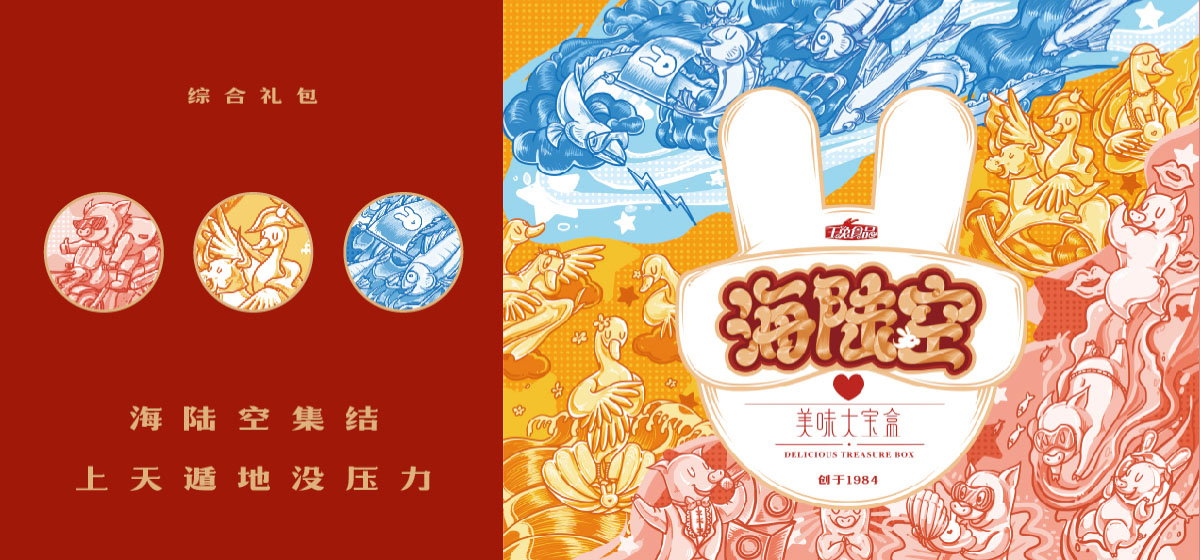 豬事如意,歡天喜地;力壓群雄、屬我最靚;魚躍龍門,翻江倒海;創(chuàng)作了3幅以地上跑的天上飛的海里游的美味主題插畫,美味大寶盒寓意明確。