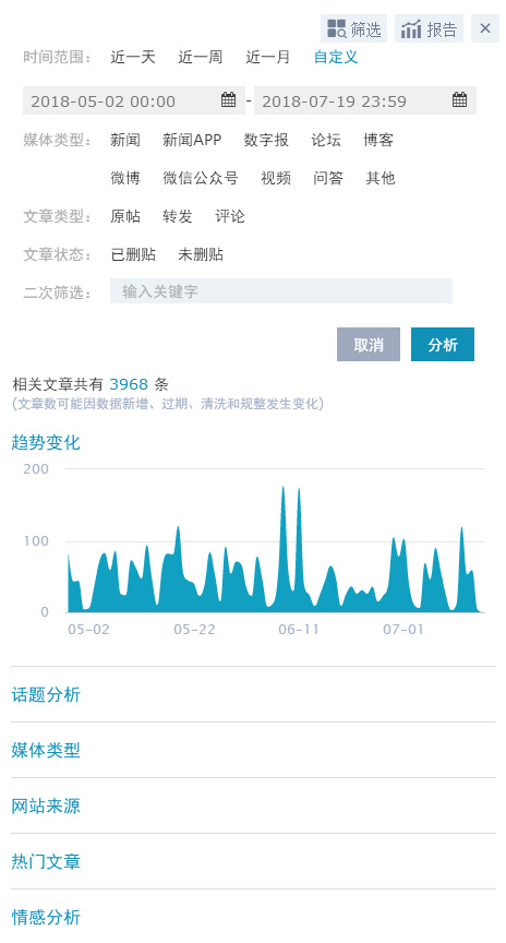 可自主設置每個主題2000字符以內的關鍵詞組合進行實時監測,自由修改,添加,刪除,信息實時同步刷新