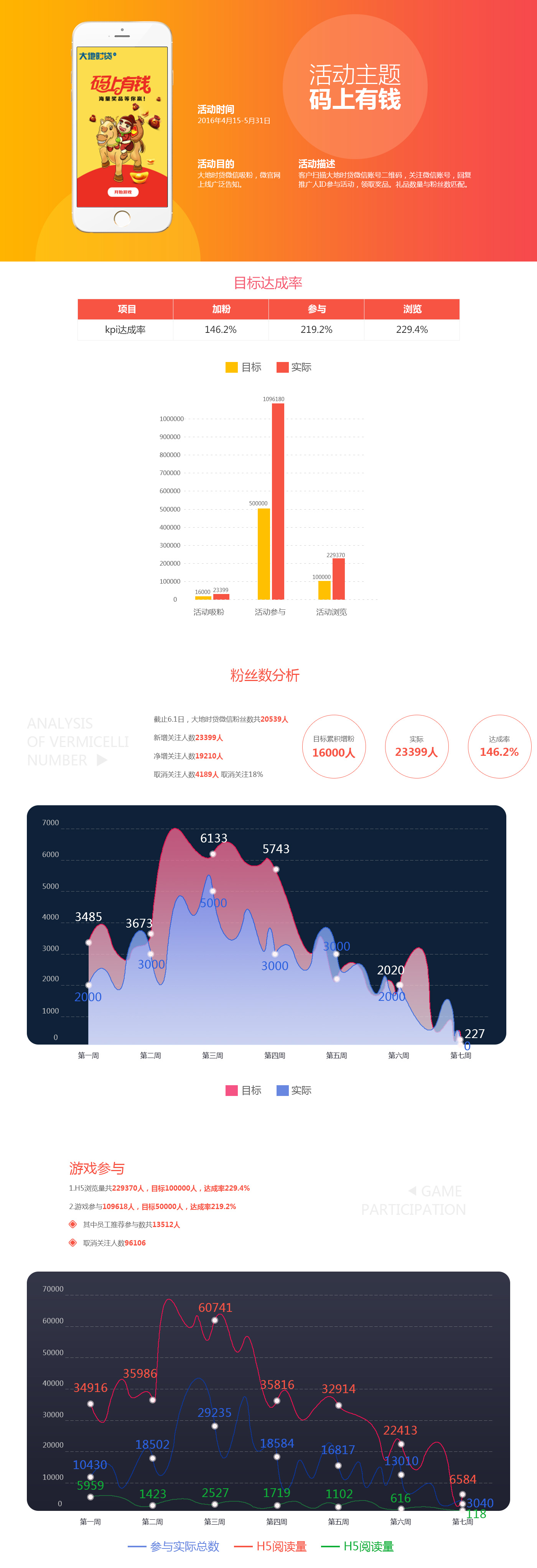 大地微信吸粉,微官網上線廣泛告知活動,助騰從項目前期活動方案策劃,到項目落實執行再到最后順利達標完成進展非常順利,kpi活動目標吸粉16000人 ,實際達到23399人(新增廣關注人數) ,達成率146.2%,參與量 219.2%,瀏覽量229.4%以上。