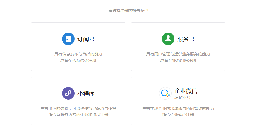 微信公眾賬號(hào)分為:服務(wù)號(hào)、訂閱號(hào)以及企業(yè)號(hào),截止目前助騰科技只針對(duì)服務(wù)號(hào)、訂閱號(hào)以及小程序操作(如下圖);